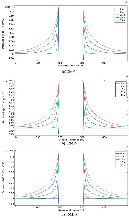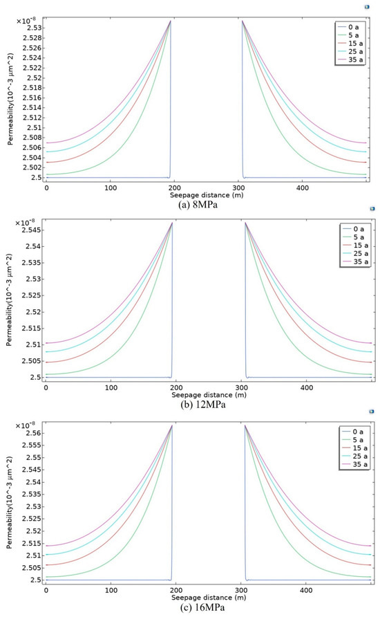 As is shown in Figure 1, salt rock permeability is primarily influenced by the pressure of the overlying strata and the CO2 pressure within the salt rock pores. Under varying CO2 storage pressures, the permeability of salt rock exhibits a similar pattern of change, which can be categorized into three stages: (1) At the onset of CO2 sequestration, the range of CO2 influence in the salt rock is relatively small. Due to the larger overlying formation pressure, the permeability of the salt rock within the simulation range decreases overall, with the rate of reduction increasing as gas storage pressure rises. Notably, in the range of 50–100 m around the cavern, the salt rock permeability reaches its lowest value, due to the combined squeezing effects of gas storage pressure and formation pressure. (2) Prior to the extension of the CO2 influence range to the simulation boundary (CO2 sequestration time of 0–25 years), the increase in CO2 pressure within the salt rock partially counteracts the overlying stratum pressure, resulting in a gradual increase in permeability within the CO2 influence range. Higher storage pressures correspond to greater increases in permeability; conversely, in areas outside the CO2 influence range, the permeability gradually decreases and stabilizes at levels observed at the beginning of the sequestration stage (Figure 8). After 5 years of CO2 sequestration, the permeability of salt rock in the 50–100 m range around the wall of the salt rock cavern significantly recovers. (3) Following the extension of the CO2 influence range to the boundary of the simulation (sequestration time of 25–35 years), the permeability of the salt rock within the simulation range recovers, with higher storage pressures leading to greater degrees of recovery. These dynamic changes in salt rock permeability result from the combined negative effects of overlying stratum pressure and the positive effects of CO2 pressure. The reduction in the effective stress on the salt rock due to CO2 pressure during the leakage and transportation processes is the primary reason for the recovery of salt rock permeability.
