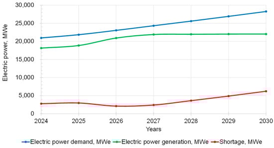 According to the forecasted balance of electric power of the Republic of Kazakhstan [22], there is a permanent shortage of electric power in the country, and a shortage of at least 6.24 GW is expected by 2030 (Figure 2).