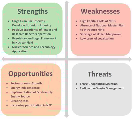 A system’s performance, quality, and prospects can be evaluated by SWOT analysis, which considers the system’s strengths, weaknesses, opportunities, and threats in order to implement management strategies to capitalize on the system’s strengths, make the most of its opportunities, mitigate the system’s weaknesses, and protect itself from potential threats [41]. By combining existing data from the sources, SWOT analysis might be able to present a visual picture of the prospects for adopting nuclear energy in Kazakhstan. It not only identifies potential benefits but also highlights potential issues and areas that require careful consideration. A brief review of existing data, let us form the SWOT matrix (Figure 5).