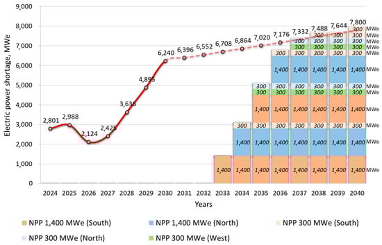 Figure 6 shows an indicative scenario of the introduction of NPP units. The forecasted electric power shortage line until 2030 is drawn by taking into account information from [22]. Due to the lack of data for the long-term electric power balance in Kazakhstan, the forecasted shortage for 2030 to 2040 is presented in the form of an approximation line with the assumption that in 2040, the relationship between energy production in accordance with [28] and the forecasted shortage will remain at the same level.