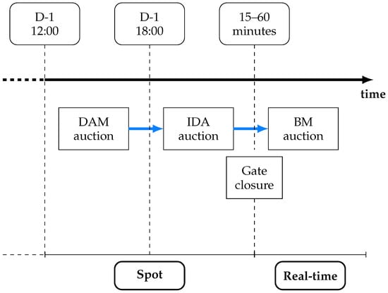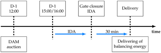 Cases of how the IDA operates in different markets are as follows: In the EPEX SPOT (European Power Exchange) market, continuous trading is available up to 5 min before the delivery period in certain regions. The gate typically closes between 30 min and 1 h before delivery in most regions. The delivery period covers the remaining hours of the operating day. For Nord Pool, the trading is available up to 1 h before the delivery period. The gate closes 1 h prior to the start of the delivery period. As with EPEX SPOT, the delivery period includes the remaining hours of the operating day [2]. DAM and IDA operation hours are included in Figure 2.