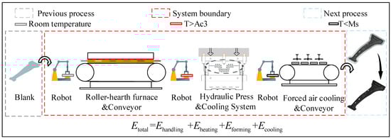 The blank is disassembled and transported to the hearth furnace for heating, then rapidly transported to the hydraulic press for forming and quenching, and finally removed from the tool for the next production stage. Figure 1 shows the typical HSPL. It should be noted that the temperature for forming the blank exceeds 700~800 °C, and the temperature before quenching must surpass the martensite start point. Moreover, the temperature after quenching is beneath the martensite finish point [28]. Given these process cycles, the energy consumption analysis is further refined by delineating the process boundaries. This study meticulously analyzes the energy consumption at each stage of the process, categorizing them into the following points: