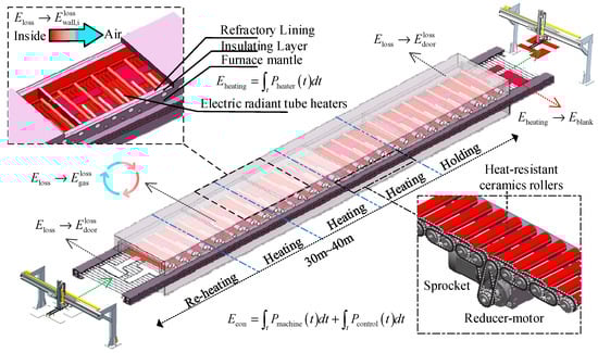 The roller hearth furnace (furnace), integral to the HSPL, utilizes diverse heating methods, including resistance, gas, or a hybrid approach. The primary mechanisms of heat transfer within this furnace are radiation and convection. This discussion is centered on the energy consumption model, particularly emphasizing the electric radiation tube heating method. In practical practical production, as illustrated in Figure 3, the furnace extends approximately 30 to 40 m long and is segmented into several distinct heating zones. The conveyor rollers of each heating zone advance forward the blank.