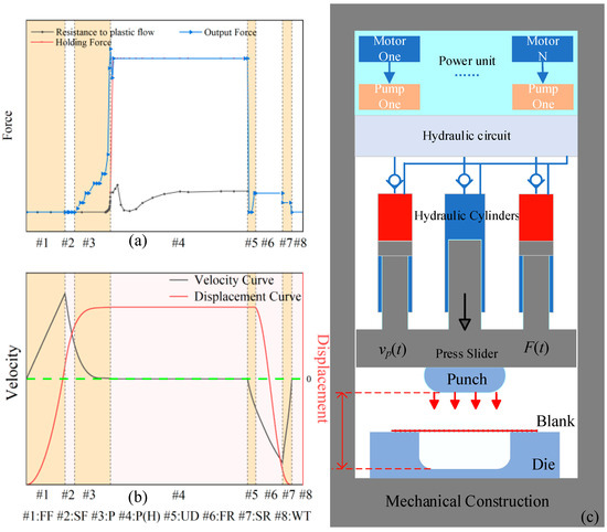 Work is performed by pushing objects to move, and energy consumption can be calculated as the integration of power over time. Power is the product of force and velocity. By understanding hydraulic machines’ energy or power transmission characteristics, energy or power balance equations can be established. Among these, the hydraulic press movement is divided into distinct zones: fast forming (FF), slow forming (SF), pressing (P), holding pressure (P(H)), unloading (UD), fast return (FR) and slow return (SR) phases as shown in Figure 4a,b. The servo-hydraulic press controls the hydraulic cylinder’s movement of the slider along the intended displacement curve by manipulating the servo motor, axial piston pump, and a series of hydraulic control valves. Different zones exhibit varying slider velocities and applied forces, leading to differing energy efficiency [19]. Consequently, the energy consumption expression for each phase is given by Equation (17):