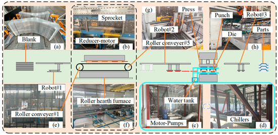 A reference model known as the Real-time Intelligent Iterative Manufacturing System (RIIMS) has also been developed for this production line [26]. It is employed for iterative analysis and optimization of production processes. Two potential bottlenecks in the transportation process were identified by analyzing the correlation between equipment and production processes. Moreover, the increased workload of handling robotic arms has introduced complexities in paths and temperature control for the sheet metal before forming. An analysis conducted in reference [27] indicates that the energy consumption of robotic arms is closely related to factors such as motion paths, loads, and speeds. Frequent equipment start-stop cycles and extended idle times increase energy consumption. However, the above models focus on inspecting equipment in laboratory settings while ignoring most of the actual production process problems, especially without considering the vast energy consumption difference between roller-bottom heating and multi-layer box-type furnaces. Furthermore, most production lines today are integrated with more suitable automated handling equipment for hot stamping production lines, such as four-fold speed robot arms and shuttle manipulators.