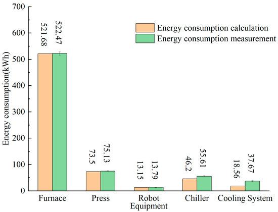 This research aims to develop a comprehensive mathematical model to analyze the energy usage of essential equipment in the hot stamping production line (HSPL) and identify opportunities for improving energy efficiency. This involves refining existing models and parameters related to energy consumption in hot stamping to ensure precise energy usage monitoring throughout the HSPL. The main focus is on accurately calculating and validating the energy consumption efficiency of equipment within a product’s production cycle on the roller hearth furnace’s HSPL. The model has proven to be highly accurate in predicting energy consumption for various equipment. The average energy consumption of the HSPL in the case study is calculated as 0.597 kwh/kg, and the actual measurement is 0.625 kwh/kg. However, it revealed significant deviation in the cooling system, primarily due to the incorrect water pump head parameters utilization. As per the model’s calculations, most energy consumption is attributed to the furnace (77.51%), followed by the press (10.92%), chillers (6.86%), cooling systems (2.76%), and robots (1.95%). Actual measurements and model calculations highlight mismatches between equipment power ratings and actual demand, resulting in average operating power significantly lower than the rated power. In line with efforts to promote low-carbon manufacturing, practical approaches are being explored to conserve energy and enhance overall process efficiency by refining process parameters, reducing quenching duration, improving SPM on the production line, and adjusting load matching.