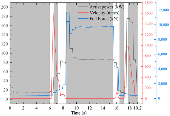 where stage(m) represents the different speed stages of equipment operation, m = 1, 2, 3, 4, 5, 6 represents FF, SF, P, P(H), UD, FR, and SR, F(t) is the function of the output force of the hydraulic cylinder of the stamping machine with time, vp(t) is the function of the moving speed of the press slider with time, represents the time spent in each action stage, The expression of each action stage is merged to calculate Eworking, as defined by Equation (18):