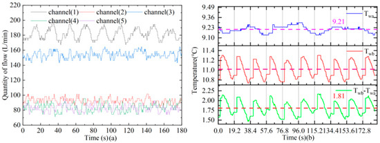 The number of flow curves of the channels within the mold in the cooling system is shown in Figure 11a, where it can be seen that the flow rates of each channel are maintained near a constant value and do not exhibit periodic fluctuations, so the tw = 1 h. The Twa parameter in Figure 11b shows that the inlet temperature of the mold channel is constant, proving that the chiller system is operating normally. The Twb parameter shows that the outlet temperature is affected by periodic fluctuations, with a marked increase in temperature during quenching. Therefore, the cooling system energy consumption can be calculated, and specific parameters are listed in Table 5.