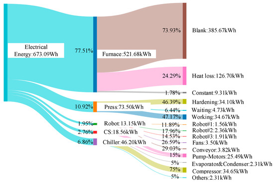 With the parameters extracted from the information provided and additional details from the equipment manuals for the production line, we calculated the energy consumption components and created the Sankey diagram as follows in Figure 12. The model calculates that the HSPL consumes a total of 673.09 kWh of electric energy per hour. The average energy consumption of the HSPL in the case study is calculated as 0.597 kWh/kg, and the actual measurement is 0.625 kWh/kg. To power the furnace, 77.51% is used, and 73.93% is used to heat the blank at an average electric energy quality ratio of 0.342 kWh/kg. Additionally, 24.29% of the electric energy is dissipated as heat loss. The second largest consumer is the stamping machine, accounting for 10.92%, with stamping and holding each representing approximately half (47.17% and 46.39% respectively), while standby consumption makes up the remainder. Subsequently, chiller unit electricity consumption accounts for 6.86%. Analyzing specific equipment’s energy consumption within this unit proves challenging due to complex energy conversion and intermediate parameters involved; however, based on historical data and proportions, fixed percentages have been assigned—with compressors constituting over 75% of total consumption as shown in the figure—while other components and auxiliary equipment account for the rest. Thanks to advanced servo motors and control technology development, automation equipment exhibits the lowest energy consumption ratio. While it is evident from the above figures how energy distribution occurs across different processes, further research and analysis are required to understand the interrelationships between various forms of energy usage.