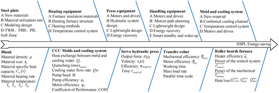 To meet global environmental protection goals, including carbon peak and carbon neutrality, countries have significantly increased their investment in the automotive industry’s green and sustainable development [1]. Within this scope, lightweight technology emerges as a critical area of focus. Using ultra-high-strength steels, specifically hot-stamped Steel (HSS) in body-in-white components, has become a pivotal technical metric for leading automobile manufacturers [2]. This advancement has resulted in the development of the hot stamping industry chain, where elements like A-pillars, B-pillars, side impact reinforcement beams, and bumpers are increasingly manufactured using Ultra-High Strength Steel through hot stamping. According to a 2017 study by Roland Berger, the percentage of hot-stamped parts in the BIW market is forecasted to increase from 8% in 2015 to 17% by 2025 [3]. These procedures necessitate specialized equipment, including heating furnaces, rapid transport robots, press machines, cooling systems, and laser trimming. The energy expenditure of these devices contributes to the overall lifecycle of hot stamping products. This study aims to enhance energy consumption’s modeling and calculation capabilities in hot stamping production by developing a practical model that accurately represents energy usage. Establishing such a model will improve the accuracy of predicting energy consumption in hot stamping, thereby assisting equipment manufacturers and production line managers in aligning their efforts to address discrepancies between equipment energy consumption and production planning.