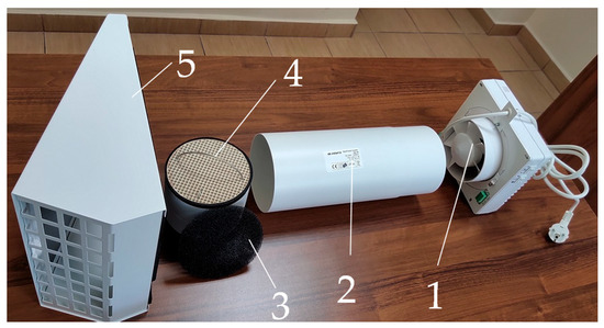 Components of a commercially available single-duct ventilation unit with heat recovery (air filter was removed to show the structure of the heat exchanger). 1—reversible fan with control unit, 2—air duct, 3—dust filter, 4—ceramic accumulative heat exchanger, 5—external cover.
