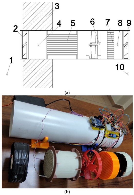 The measurement station: (a) schematics; (b) a photo with internal parts exposed. 1—external temperature sensor, 2—exhaust fan, 3—wall, 4—exhaust temperature sensor (thermocouple), 5—accumulative heat exchanger, 6—turbine airflow sensor, 7—honeycomb flow equaliser, 8—supplied-air temperature sensor (thermocouple), 9—supply fan, 10—room temperature sensor.