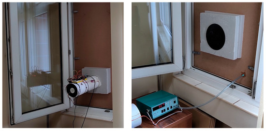 The entire measuring station was placed in a window opening in an office room located on the ground floor in a building of the Silesian University of Technology. It was mounted in place using a wooden board with thermal insulation and rubber seals along the edges (Figure 5). Moreover, on the board, there was a connector opened towards the outside environment, the purpose of which was to measure the pressure difference between the room and the outside. Since the ventilation device could affect the pressure difference, the measurements were made with the device removed and with the opening closed (Figure 5). To measure the pressure difference, a CMR-10 micromanometer with an accuracy of ±0.005Δp + 0.5 Pa was used.
