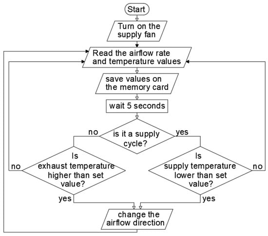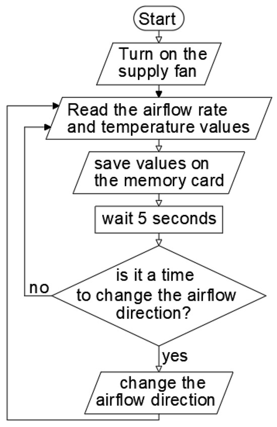 This control strategy (Figure 7) makes the fan speed dependent on the readings of an airflow rate sensor. At first, the fan is started at the speed necessary to achieve the desired airflow with no pressure difference. Then, every 5 s, the regulator checks if the airflow measured by the turbine sensor is correct and slightly adjusts the fan speed. The working of this regulator is similar to the integral part of a PID (proportional–integral–derivative) controller. At the end of the supply and exhaust cycle, the current value of the signal controlling the fan is saved to memory. When the next cycle starts, the value of the signal at the end of the previous cycle of the same type is loaded. For example, at the start of the supply cycle, the fan speed is identical to the speed at the end of the previous supply cycle. Since the flowmeter turbine needs some time to stop and start rotating in the opposite direction, the first ten seconds after the airflow direction changes are not taken into account in the process of changing of the fan speed.