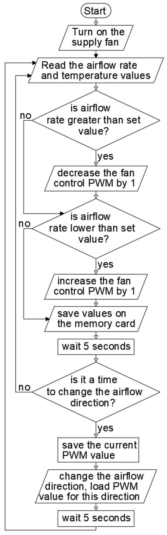 This control strategy (Figure 6) is used in case of commercially available devices. The fan speed is constant, set to achieve desired airflow through the device with no pressure difference between inside and outside environment. The airflow rate can be selected by the user from among predefined values.