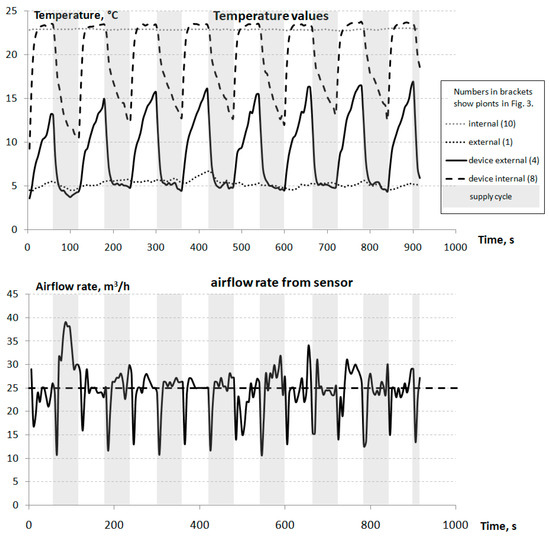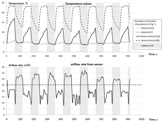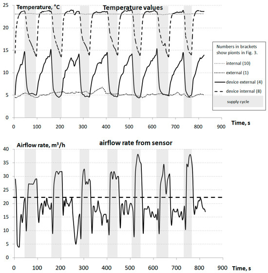 The temperature courses (Figure 9, Figure 10 and Figure 11) were measured at an outside temperature of approximately 5 °C and an inside temperature of about 23 °C (exact values are given in Figure 9, Figure 10 and Figure 11). The pressure difference between the inside and outside with no airflow through the device (Figure 5) was fluctuating, but the mean value from 10 min of measurements was equal to 7.4 Pa. The measurements for all the control strategies were made subsequently to achieve measurements conditions as similar as possible.