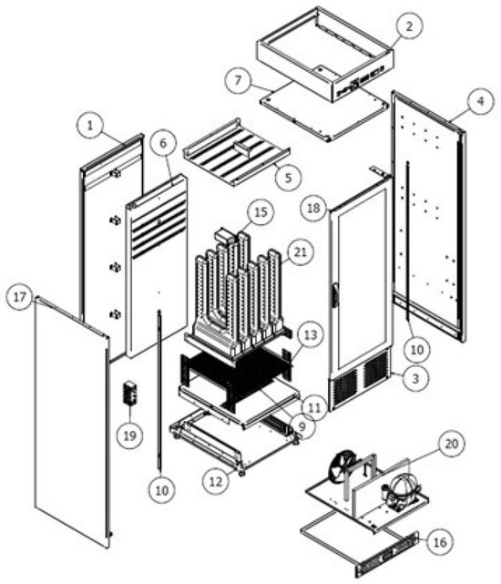 Innovative design of the drying cabinet under structural changes: (1) back of chamber; (2) control panel; (3) front panel; (4) right side of chamber; (5) top perforated sheet for ozone supply; (6) rear perforated sheet for air intake; (7) ceiling of chamber; (9) sheet for air blowing; (10) LED lighting; (11) chamber bottom; (12) cabinet base; (13) shoe shelf; (15) ozone generator; (16) drip tray; (17) left side of chamber; (18) glass door; (19) electromagnetic lock; (20) air duct baffle; (21) clothes-blowing channels.