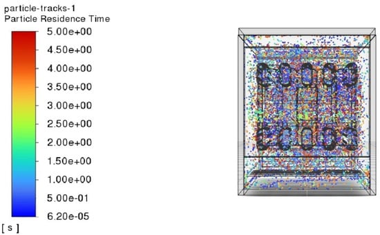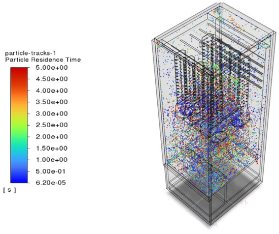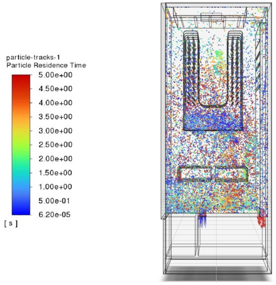 The simulation results obtained with the DPM (Figure 3, Figure 4 and Figure 5) confirmed compliance with the design assumptions for blowing clothes. In the images showing the simulation results, it can be observed for how long a particular particle stayed in a given flow area during the simulation. In the results shown, it can be seen that the particles were transported into the interior of the canals. This is evidenced by the fact that the particles have the smallest resting time in the fan area, as indicated in blue in the figures. This is a deliberate effect that causes some of the generated ozone to be directed upward into the device and, importantly, also into the interior of the ducts. As a result, clothes are sanitised both internally and externally. This undoubtedly represents the greatest advantage of the new cabinet design over the initial appliance design. The DPM allowed for a qualitative analysis of the trajectory of the particles, which confirmed the assumptions made about the geometry of the drying chamber and the blowing channels. However, quantitative analysis in this case is difficult, as only the ozone concentration can be measured, which is not a direct result of the simulation. Therefore, the ST simulation method was developed to obtain more accurate quantitative data and a better understanding of the ozone distribution in the workspace.