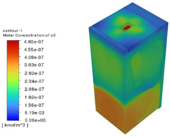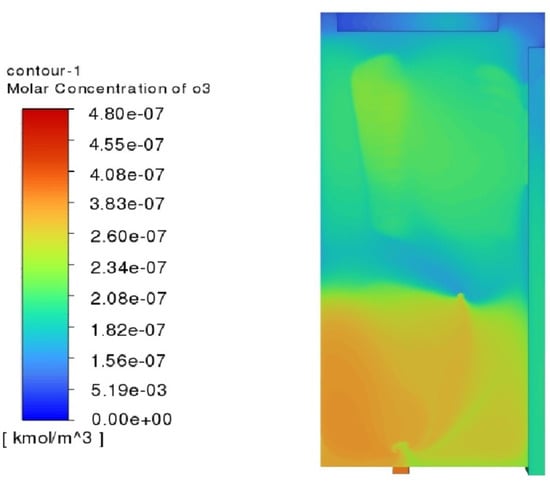 A similar problem to ozone propagation is the analysis of CO2 concentration. In [8], the authors investigated air quality in a laboratory without ventilation. A CFD numerical model was created to analyse the quality. The simulation results showed agreement with expectations; the CO2 concentration increased over time, reaching maximal values depending on the configuration considered and the height studied.