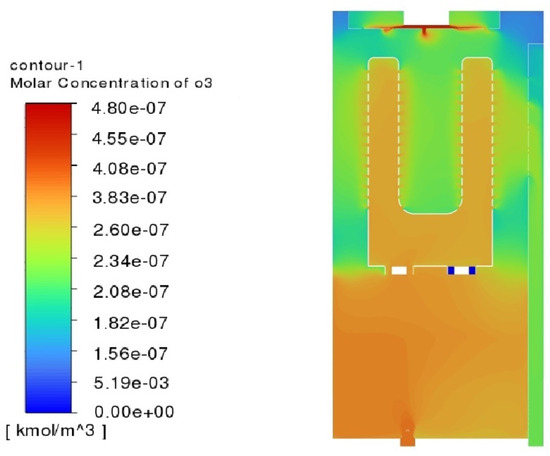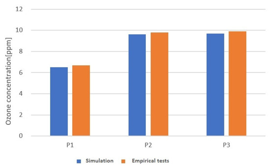 After the calculations, it can be observed that the ozone concentration inside the cabinet resulting from the simulation is between 6.5 and 10 ppm, which is close to the empirical results. Figure 11 shows the ozone concentration measurement points obtained during the numerical tests, while Figure 12 compares the results of the empirical tests with the simulations.