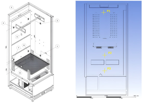 Measurement points in experiment and Species Transport simulation, used for experimental verification. Numbers 1–8 indicate the position of DFRobot SEN0321 ozone sensors, P1, P2, P3 indicate the position of OZ-1000 ozone detectors.