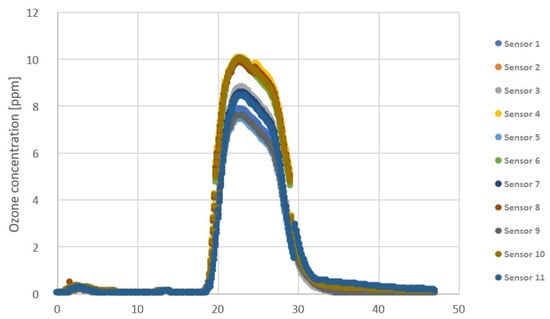 The arrangement of the ozone sensors during the measurements is shown in Figure 9 and Figure 10. The resulting ozone concentrations were time-varying due to particle decay. The simulation, on the other hand, was carried out for a steady-state problem. The time course of ozone changes at the measurement points is shown in Figure 11.
