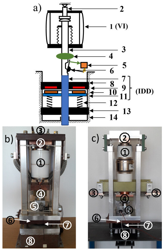 The IDD is a high-power device that, with great acceleration and while under the influence of a current pulse with a maximum value of several kA and a frequency of (1.2 ÷ 2) kHz, allows the opening of the circuit breaker contacts. In combination with the vacuum interrupter VI, it forms the vacuum contact unit VCU, shown in Figure 1a.