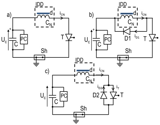 The IDD power supply circuit configurations: (a) CNT (basic); (b) CNT + D1—with a reverse diode D1 on the IDD coil CN; (c) CNT + D2—with a diode D2 on the thyristor T. IDD—induction-dynamic drive, d—disk, CN—drive coil, T—thyristor, C—capacitor, PC—power supply charging capacitor to voltage UC, Sh—shunt.