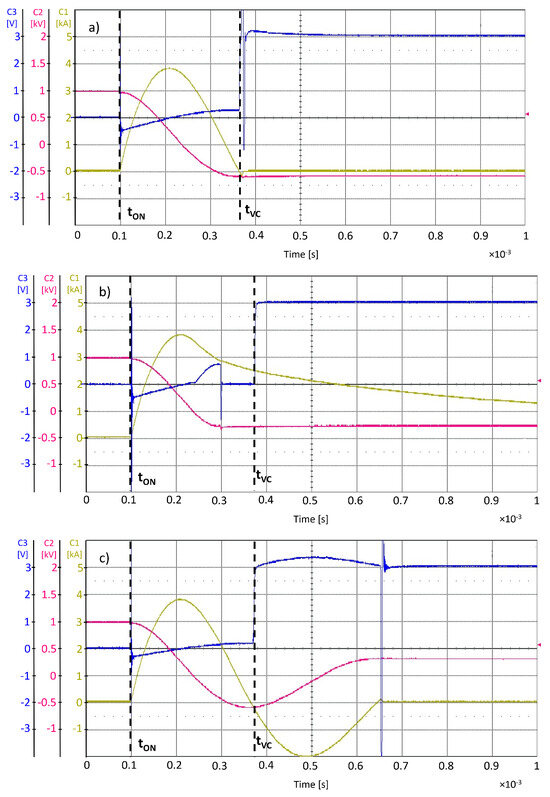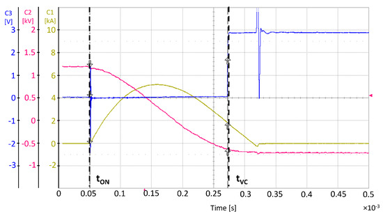 The waveforms for the circuit in Figure 2a. C1—coil current iCN; C2—capacitor voltage uC; C3—VI contacts voltage; tON—the moment when the ON signal is applied to thyristor T; tVC—the moment when the VI is opened. Time tVC-tON—response time of the VCU.