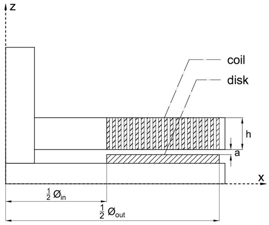 The IDD cross-section symmetry about the z-axis was assumed. Symbols: h—height of the coil, a—gap between coil and disk, ⌀in—inner diameter of coil and disk, ⌀out—outer diameter of coil and disk.
