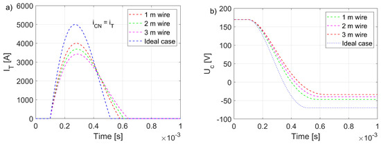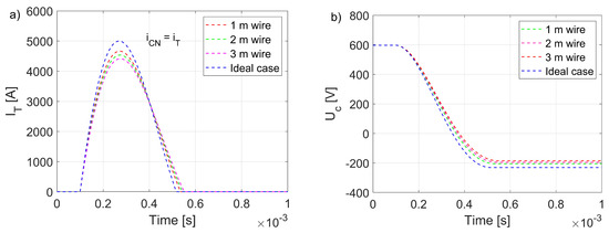 Current waveforms ICN (a) and capacitor voltage UC (b) for the IDD equipped with an 18 turn coil CN connected in CNT configuration (see Figure 2a) for the ideal case and three lengths of the main circuit.