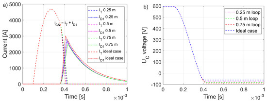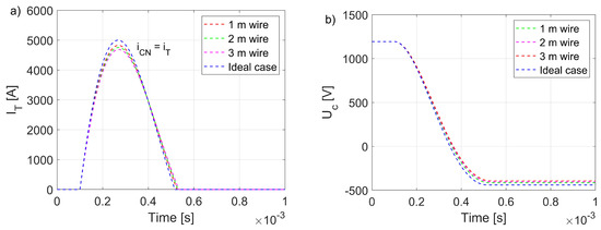 Current waveforms ICN (a) and capacitor voltage UC (b) for the IDD equipped with a 28 turn coil CN connected in CNT configuration (see Figure 2a) for the ideal case and three lengths of the main circuit.