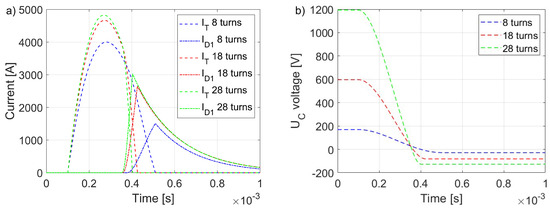 The effect of the length of the coil–diode connection on the waveforms in the power supply circuits of drives with coils, where the number of turns is 8, 18, and 28, was also checked, as shown in Figure 9. In this case, the length of the coil-capacitor connection was assumed to be 1 m, and the coil–diode circuit was assumed to be 0.5 m.
