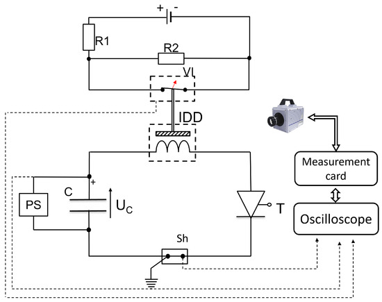 Diagram of a laboratory stand for testing the properties of VCUs equipped with the IDD connected in CNT configuration (see Figure 2a). IDD—inductive–dynamic drive, VI—vacuum interrupter, C—drive capacitor, PS—capacitor charging converter, uC—capacitor voltage, T—thyristor, Sh—non-inductive shunt, R1, R2—voltage divider.