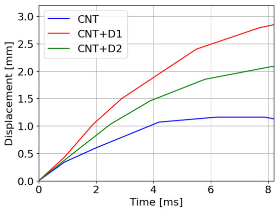 Displacement curves for the VCU equipped with the IDD connected in the configurations CNT, CNT + D1, CNT + D2 for a capacitor C charged to Uc = 1000 V.