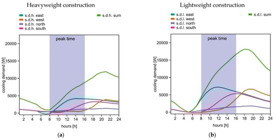 Based on Table 12, the heat load of the east- and west-facing rooms is the highest, and the cooling capacity requirement of the lightweight rooms is significantly higher than that of the heavyweight structured rooms. If each room has an individual cooling system, then those need to be sized according to the values found in Table 12. The building’s required cooling demand is lower than the sum of the rooms’ maximum cooling demand because the heat load in the rooms does not occur at the same time. This fact can be used when designing a central cooling system. Figure 9 shows the required cooling demand of the rooms and the aggregated curve of the heat load of the buildings. Figure 9 presents the time course of the cooling demand in the case of light- and heavyweight construction on summer, hot, and torrid days. The heat load of the rooms with different structures is summarized in Figure 9 by orientation and absolute value.