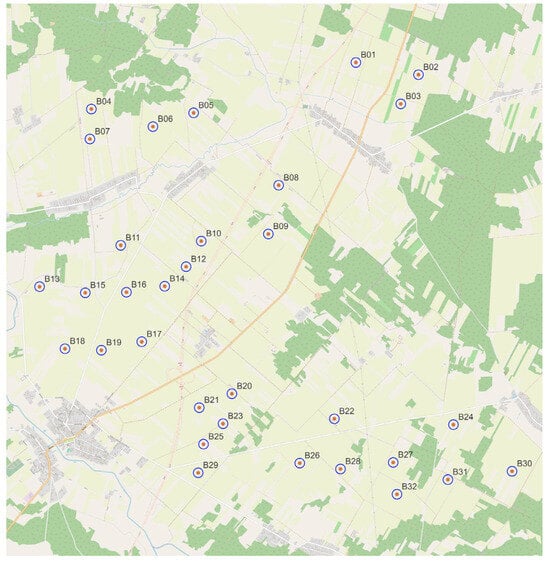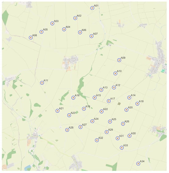Two wind farm sites, A and B, were analyzed. The facilities were designed for implementation in Central Europe. Based on the results of the wind measurements and the productivity characteristics of the available wind turbines, the investor selected the equipment. Farm A consists of 34 V136–3.45 MW turbines with a tower height of 131 m. Farm B plans to install 32 V162–6.2 MW turbines with a tower height of 119 m. Two locations with significantly different wind conditions were selected. Due to the equipment manufacturer’s requirements, the turbine towers were arranged, maintaining a minimum spacing of 3 rotor diameters between them. In the cases analyzed, the minimum distances between the turbine towers at Farm A and B were 408 m and 486 m, respectively.