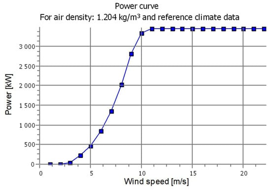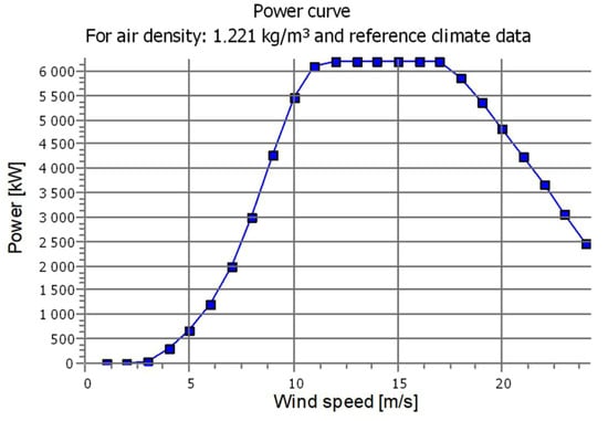 Based on the results of the wind measurements and the productivity characteristics of the wind turbines, the productivity of the wind farm (WF) was evaluated. Knowing the productivity characteristics of the power plant, the value of power was estimated for wind speeds falling into successive class intervals of 0.5 m/s. In the next step, the energy generated by the power plant over one year was calculated. Calculations were performed in each class interval. Summing up the component energy from all intervals, the total energy generated over one year by the power plant was obtained [35,36].