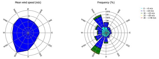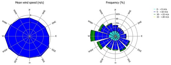 Considering the assumptions presented in Section 2, wind data for Farm B were obtained, and energy analyses were performed. The average wind speeds and directionality at a height of 119 m above ground level are illustrated in Figure 8.