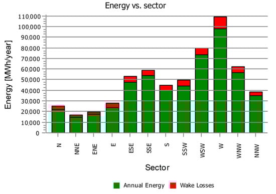 Taking into account the Weibull distribution (Figure 6) and the power curves of the selected turbines (Figure 3), Figure 7 shows the distribution of annual turbine productivity in each sector of the wind rose. The wake losses are also shown.