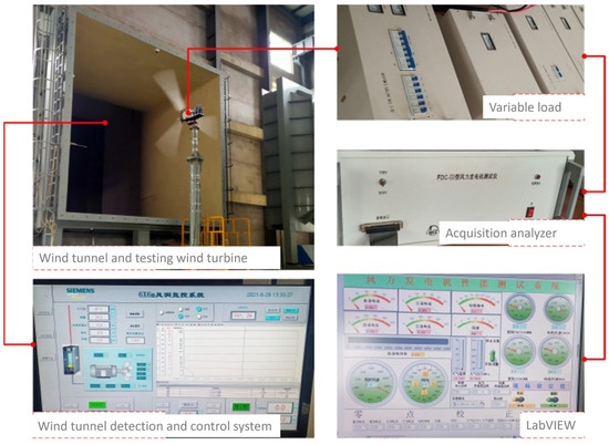 The wind tunnel has a centerline length of 230 m and a maximum height of 16 m. For the experiment, a 6 m × 6 m open test section was selected, with a test section length of 25 m and a maximum wind speed exceeding 30 m/s. The power section has a maximum power capacity of 450 kW. The swept area of the test wind turbine rotor is 20% of the cross-sectional area of the wind tunnel’s open test section, which meets standard requirements.