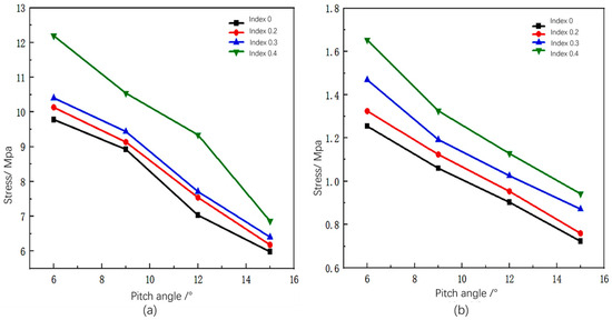 Figure 29 shows the stress response characteristics at the gear root within a rotation cycle under different shear indexes. The figure clearly shows that, under different shear index conditions, the average and standard deviation of the stress response at the gear root are positively correlated with the pitch angle. For example, under a shear inflow condition with a shear index of 0.4, the average stress response at the gear root decreases from 11.594 MPa to 6.86 MPa, marking a reduction of 40.83%, and the standard deviation decreases from 1.653 to 0.942, marking a reduction of 43.01%. This indicates that adjusting the pitch angle can effectively reduce the stress response level at the gear root and decrease its stress fluctuation range, thereby improving the stability and reliability of the pitch control mechanism.