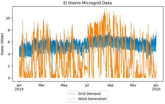 El Hierro electricity demand and wind generation for a year [19].