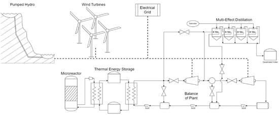 This deployment scenario examines replacing diesel generation on the island with a microreactor. The reactor is connected to a thermal energy storage (TES) system, which dispatches heat to a combined heat and power (CHP) plant to produce electricity and heat, as illustrated in Figure 3. The heat will be used to power a thermal desalination plant using a multi-effect evaporator (MEE) system. While reverse osmosis (RO) desalination systems are typically more efficient than thermal systems such as MEEs, they require comprehensive pretreatments for use with high-saline water, such as seawater, and produce less pure water with a higher output salinity [21]. MEEs also require less maintenance, are simpler to operate, and can directly use low-grade heat. For these reasons, MEE systems may be a better option for remote microgrids where the limited infrastructure and resources may make the operation of RO systems much more complex. Due to these considerations, an MEE system was chosen as the desalination technology in this deployment scenario. The MEE system will operate at a constant water production rate and will nominally use low-temperature steam (120 °C).