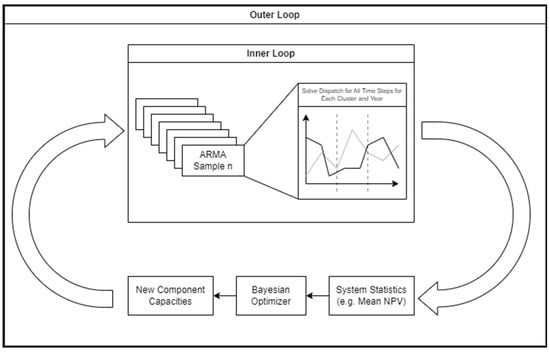 Figure 5 shows the HERON workflow. With the autoregressive-moving-average (ARMA) ROMs for demand/generation and surrogate models, a HERON input file is created. HERON will use this input file to generate a RAVEN input file of the outer optimization loop. This outer loop optimizes the component variables, such as capacity to maximize the NPV of the system. To find the NPV of the system with a given set of component sizes, the outer loop creates and automatically runs another RAVEN input file for an inner loop. This inner loop uses the ARMA ROM to create a set of histories. Then, each synthetic history is broken into years and clusters, with each year having one or more clusters. For each cluster, the optimized dispatch for each component is found. From this, the total NPV for each set of histories can be determined. The mean NPV of the set of histories is used to inform the outer loop optimizer. With this mean, value the outer loop perturbs the component variables and generates a new inner loop with a new set of synthetic histories [34].