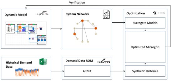 Figure 6 depicts the proposed workflow for researching IESs for different microgrids. Using existing and newly created models from HYBRID, a dynamic systems model for each scenario will be created. From this model, a system network and surrogate models will be created for the HERON input file. Historical data from El Hierro was used to train a ROM using ARMA models. With the surrogate models; ARMA ROMs; and additional economic data, such as capital costs and operational costs, the full HERON input file will be created. With this, the microgrid will be optimized using the Bayesian optimizer built into RAVEN and HERON. HERON will also create the dispatch profiles for each component, such as the wind turbines, TES, microreactor, and BOP. Using the demand profiles for the ARMA ROMs as inputs for the dynamic models, the results of the HERON dispatch can be analyzed and validated against the full dynamic model.