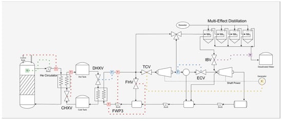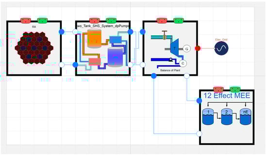 A prismatic HTGR reactor model from HYBRID was used for the microgrid IES dynamic model. This reactor model simulates the primary loop of the reactor while taking into account the feedback mechanisms of the core [35]. This model provides the heat source, for which energy will be transferred through the TES system to be converted to electricity and clean water via the BOP and MEE system.