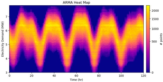 A ROM for electrical power demand profiles and wind generation was trained with real power data from El Hierro [19]. Figure 9 is a heat map of a large number of electrical demand signals created by the ARMA ROM.