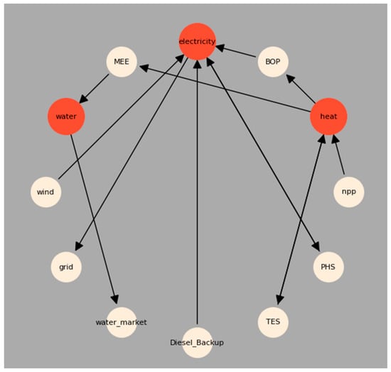A HERON input file requires a set of information for each component in the system. This set of information creates a surrogate model for the optimizer to use. Because of the large number of calculations performed, these are very simple models. The inputs for the surrogate models are typically the resources a component produces or demands, capacity limits, and economic data. In this scenario, the microreactor and TES size are the components that were optimized. As HERON is an economic optimizer, costing information is needed for many of the components. Microreactor costs were taken from Abou-Jaoude et al. (2023) using the medium level cost estimates [39]. The TES costs were taken from Gautam, Andresen, and Victoria (2022) [40], and only the energy CAPEX and OPEX were used as it is assumed that the power CAPEX is part of the reactor CAPEX; the same is assumed for the BOP component. The MEE system does not have any cost associated with it as it is the same size all HERON runs that were performed for this study. Because this and other associated costs were not used in this analysis, the absolute NPV of the system is somewhat meaningless, but the change in NPV is not, so for this analysis, only NPVs are reported. Table 2 tabulates the components in the HERON input file, and Figure 10 is a diagram of the system as modeled in HERON.