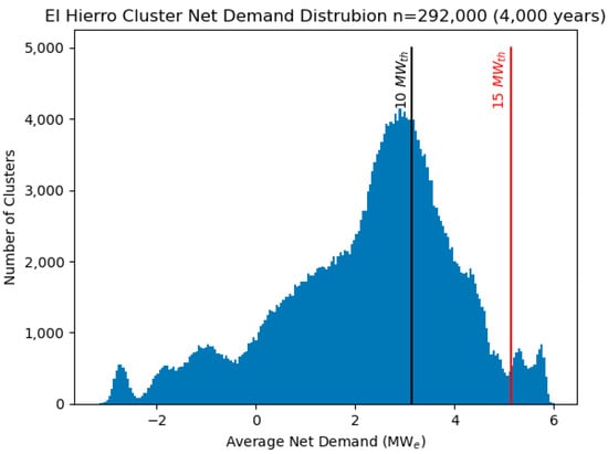 El Hierro (Figure 1) is the smallest of the seven main Canary Islands, both in area (258.5 km2) and population (11,338). Currently, its residents’ freshwater needs are met with groundwater and three desalination plants. The need for desalinated water is expected to continue to grow [18]. The electrical grid on El Hierro is an isolated microgrid that is not connected to the grids of any of the other islands or the mainland. Currently the island relies on a mix of wind and diesel power, with an average electrical demand of 5.6 MWe [19]. The electricity demand and wind generation profile for a year is shown in Figure 2. There is also a pumped hydro storage (PHS) system on the island.